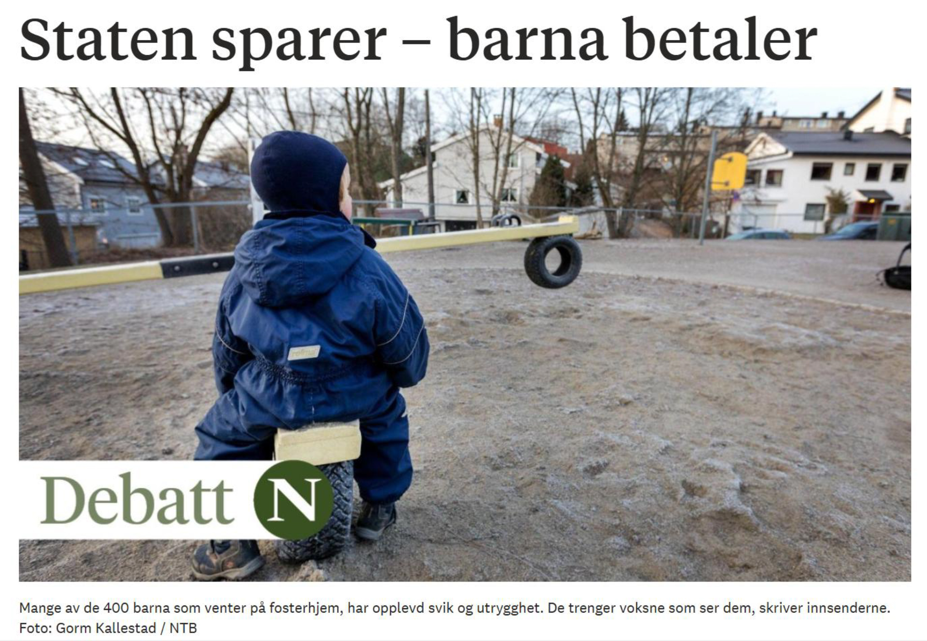 Noen barn trenger et hjem med sterkere støtte og en frikjøpt forelder. Men staten har ingen plikt til å hjelpe kommunene med å finne spesialiserte fosterhjem. Derfor blir disse barnas fremtid avhengig av postnummer og kommunebudsjett, tilfeldigheter råder over barnas skjebne når ikke staten tar ansvar.