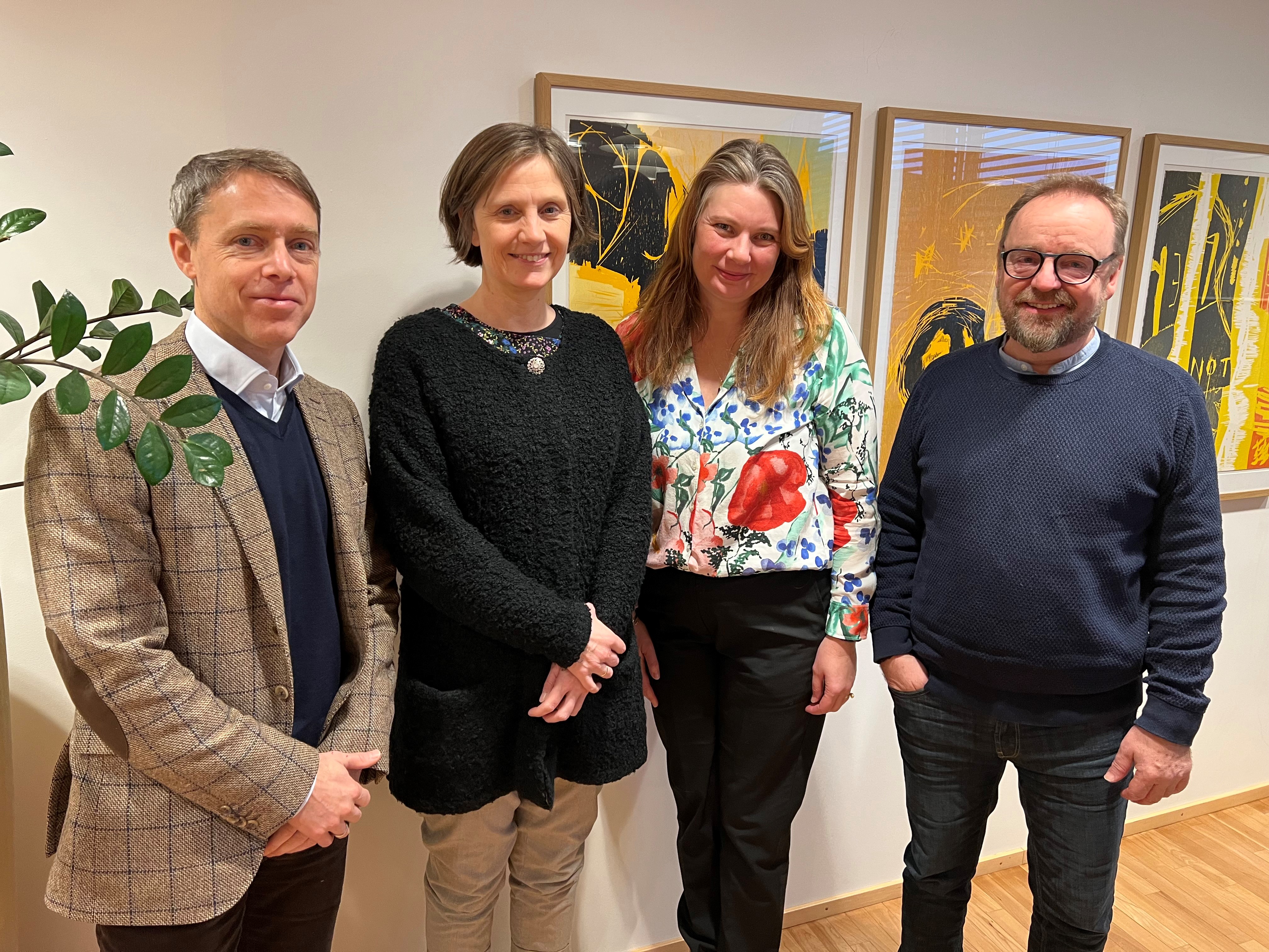 Torsdag 8.desember møttes fra venstre direktør Erik Eide (Virke ideell og frivillighet), statsråd Kjersti Toppe (Sp), bransjesjef Anne Kjersti Toft (Virke) og generalsekretær Helmuth M. Liessem.